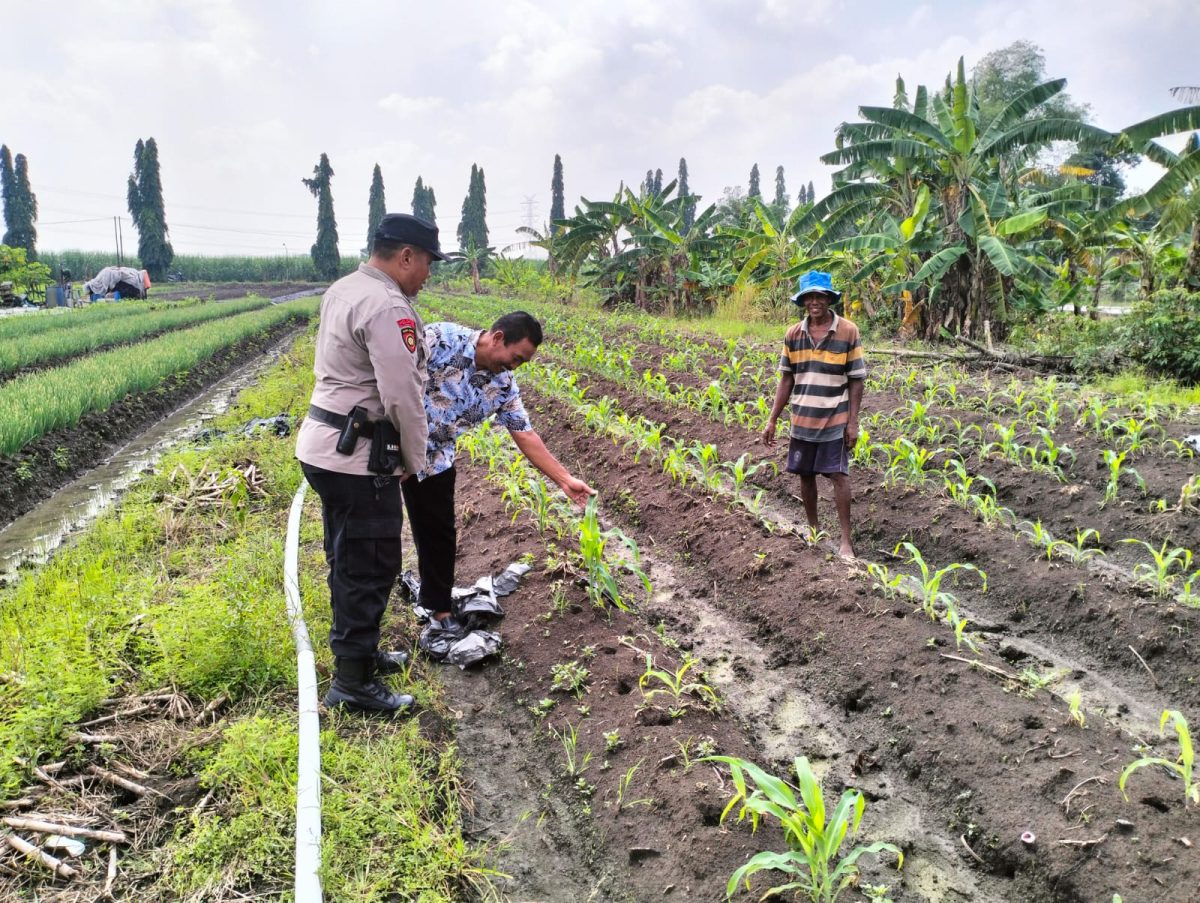 Bhabinkamtibmas Desa Gamping Polsek Krian, Aipda Abdul Gofur, bersama Kepala Dusun (Kasun) setempat, Senin (24/3/2025), melakukan pengecekan terhadap pertumbuhan tanaman jagung di lahan milik Jiono, warga Desa Gamping, Kecamatan Krian. Kegiatan ini merupakan bagian dari upaya untuk memantau dan mendukung program ketahanan pangan Polresta Sidoarjo Polda Jatim di wilayah tersebut.