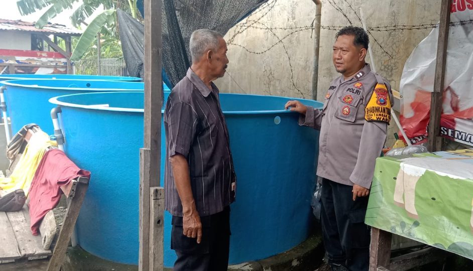 Bhabinkamtibmas Desa Tambak Sawah Polsek Waru Aiptu Sugeng melakukan pengecekan sarana dan prasarana Pekarangan Pangan Bergizi (P2B) budidaya ikan lele warga setempat, pada Senin (1/4/2025).