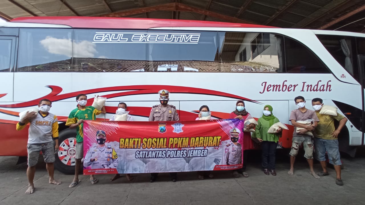 Sebagai upaya untuk meringankan beban masyarakat yang terdampak Pandemi covid-19. Polres Jember melalui Satuan Lalu Lintas Polres Jember malalukan Bhakti Sosial PPKM Darurat, memberikan bantuan paket sembako kepada Kaum Duafa, Kru PO bus Jember Indah di Jln. Imam Bonjol Tegal besar Kaliwates, Kru PO bus Maxi 77 Trans Jember di Jln. Brawijaya Kaliwates, dan kepada Abang Becak. Selasa (13/7/2021)