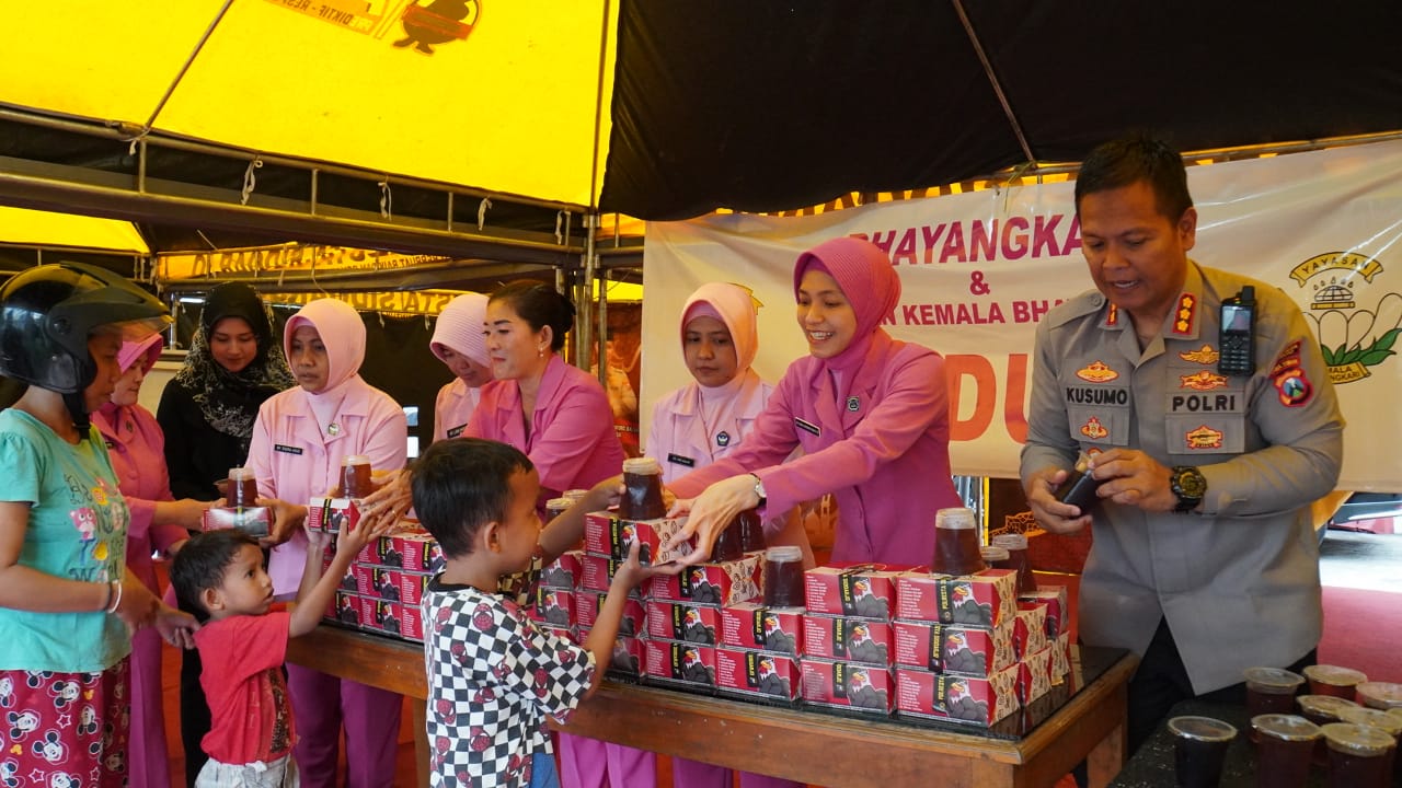 Bhayangkari dan Yayasan Kemala Bhayangkari (YKB) Cabang Kota Sidoarjo peduli masyarakat, terutama pengguna jalan di saat Bulan Ramadan. Yakni dengan membagikan takjil di Posko Ramadan Polresta Sidoarjo yang ada di pos polisi Taman Pinang Indah Sidoarjo, Kamis (13/4/2023).
