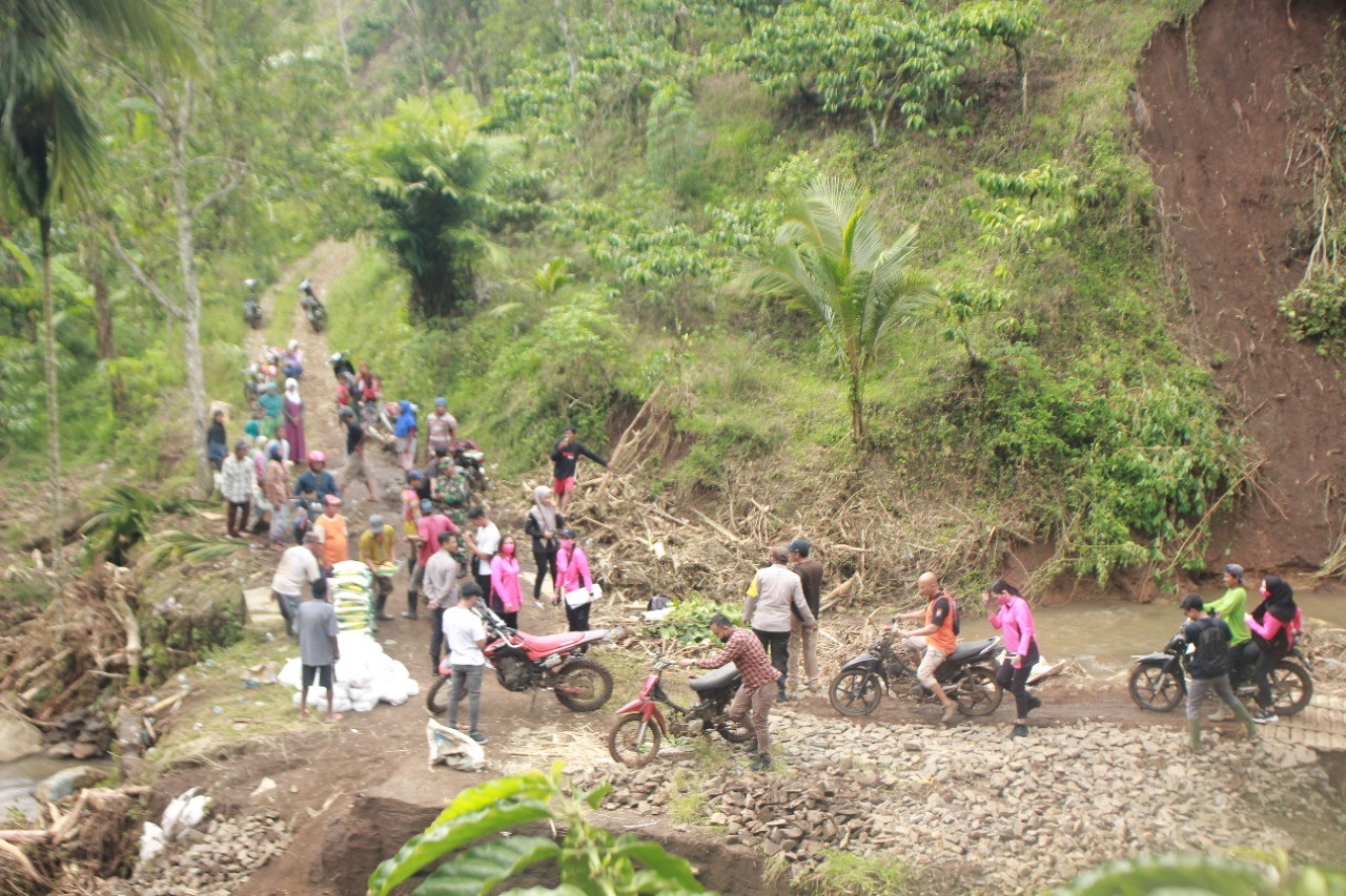 Dikarenakan medan yang cukup sulit berlumpur,licin dan sempit membuat paket bantuan disalurkan menggunakan sepeda motor yang kemudian diterima warga hanya sampai di tepi jalan menuju padukuhan dekat jembatan darurat yang terputus dengan berjalan kaki menuju padukuhan. Itu dikarenakan akses jalan menuju ke padukuhan tidak memungkinkan karena rusak.