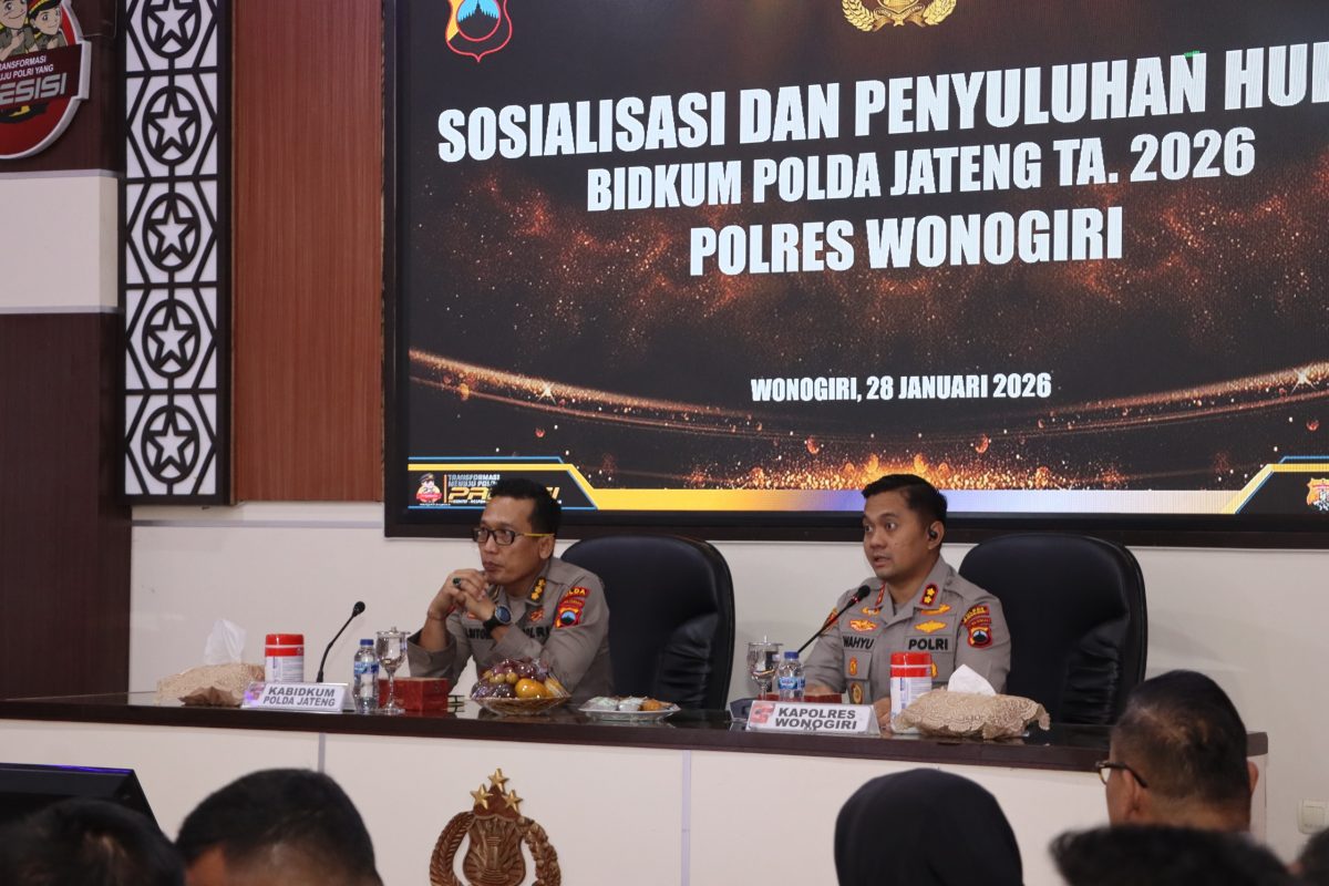 Bidang Hukum (Bidkum) Polda Jawa Tengah menggelar kegiatan Sosialisasi dan Penyuluhan Hukum Tahun Anggaran 2026 di Polres Wonogiri. Kegiatan tersebut berlangsung di Aula Sanika Satyawada Polres Wonogiri, Rabu (28/1/2026), pukul 09.20 WIB hingga 12.15 WIB.