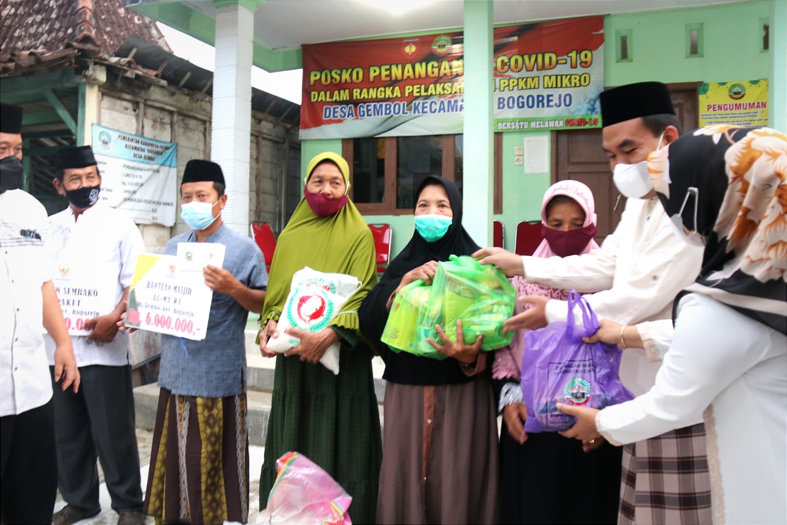 Usai berdialog, kemudian membagikan bantuan untuk takmir masjid Desa Gembol, bantuan sembako untuk masyarakat kurang mampu, dan sholat maghrib berjamaah.