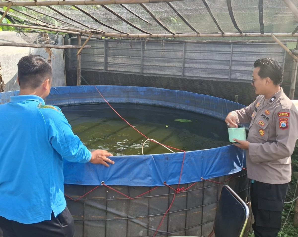 Dalam rangka mendukung pelaksanaan program Asta Cita Presiden Prabowo Subianto di sektor ketahanan pangan nasional, Bhabinkamtibmas Desa Suruh, Polsek Sukodono, Briptu Wibisono, bersama perangkat Desa Suruh melakukan pengecekan perkembangan budidaya ikan lele di kolam bioflok milik Badan Usaha Milik Desa (BUMDes) Suruh, Kecamatan Sukodono, Kabupaten Sidoarjo, Sabtu (17/5/2025).