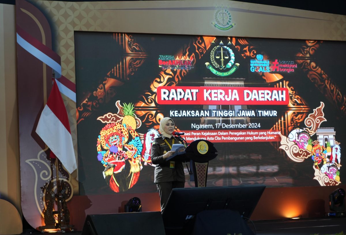 Kajati Jatim Dr. Mia Amiati S.H., M.H., CMA., CSSL., membuka Rapat Kerja Daerah Kejaksaan Tinggi Jawa Timur (Rakerda Kejati Jatim) tahun 2024 digelar pada Selasa (17/12) di Convention Hall Simpang Lima Gumul (SLG) Kabupaten Kediri.