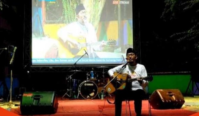 Bupati Sumenep Achmad fauzi mongsojudo tampil hibur masyarakat dengan menyanyikan tiga lagu ciptaannya di festival musik anak muda milenial yang di gelar di kafe aloska reborn, depan kantor PT garam, desa kalianget, kecamatan Kalianget, kabupaten Sumenep, Madura Jawa timur, Sabtu malam 8 mei 2024.