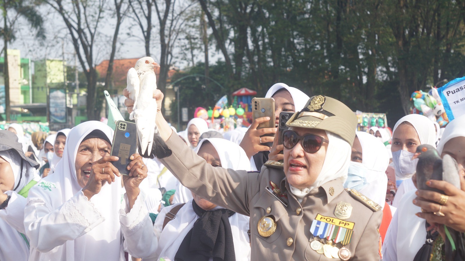 Bupati Bojonegoro Anna Mu’awanah memberangkatkan Pawai Ta’aruf PAUD Muslimat Nahdlatul Ulama (NU) Cabang se-Bojonegoro. Acara digelar di alun-alun Bojonegoro Jumat (17/3/2023).