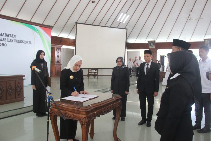 Bupati Bojonegoro Anna Mua’awanah melantik sejumlah pejabat di lingkup Pemkab Bojonegoro, Jumat (16/6/2023). Para pejabat yang dilantik merupakan pimpinan tinggi pratama, pejabat administrator, pejabat pengawas, kepala sekolah dan sejumlah guru. Pelantikan merupakan upaya menciptakan birokrasi yang efektif dan kaya akan fungsi.