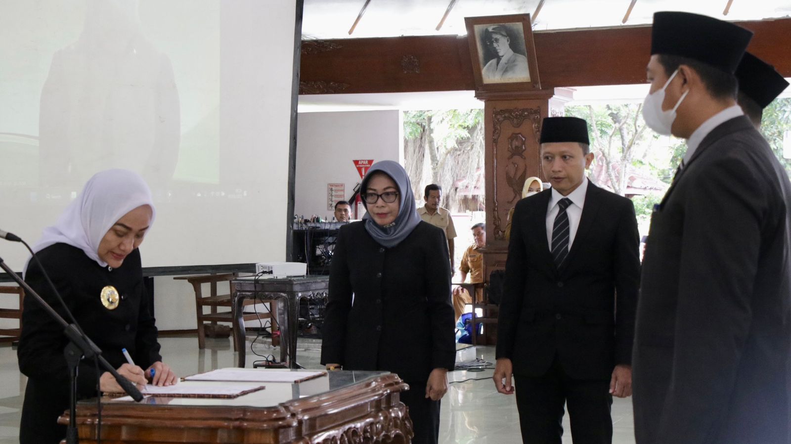 Bupati Bojonegoro Anna Mu’awanah melantik 27 pejabat di lingkup Pemkab Bojonegoro, Senin (6/3/2023) di Pendopo Malowopati. Pelantikan tersebut diantaranya sembilan (9) pengangkatan dalam jabatan administrator dan 18 pengangkatan dalam jabatan pengawas. Usai melantik pejabat, Bupati menekankan netralitas PNS, terutama memasuki tahun politik nasional.