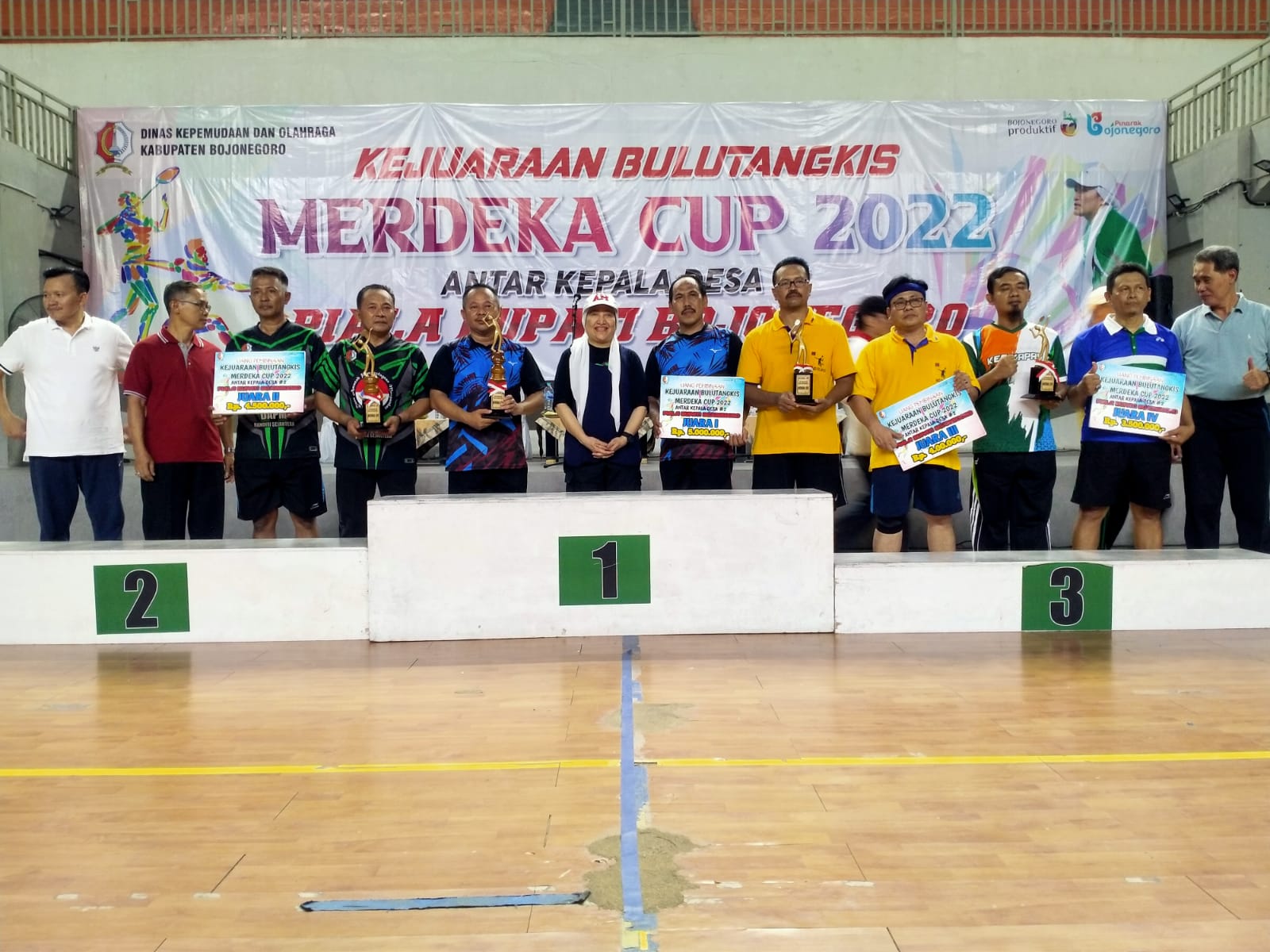 Kejuaraan Bulutangkis Merdeka Cup 2022 memasuki puncaknya, Kamis (11/8/2022). Kejuaraan antar Kepala Desa Se-Kabupaten Bojonegoro memperebutkan piala Bupati Bojonegoro ini digelar Dinas Kepemudaan dan Olahraga sejak Selasa, (9/8/2022) lalu.