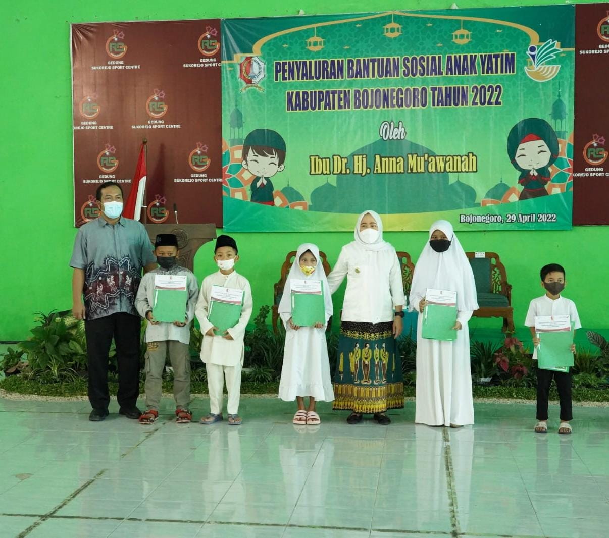 Pada kesempatan ini Bupati Bojonegoro menyerahkan Bansos berupa uang senilai masing-masing Rp 1.500.000 yang diserahkan langsung secara simbolis dan tunai kepada 412 sasaran anak yatim yang hadir dari Desa/Kelurahan Se-Kec. Bojonegoro Kota.