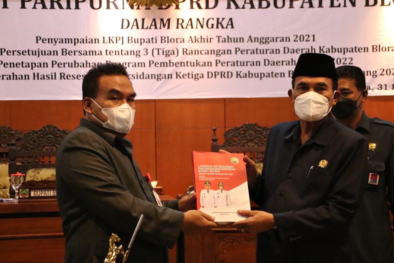 Sebelumnya, Bupati menyerahkan buku LKPJ Bupati Blora akhir tahun anggaran 2021 kepada Ketua DPRD Kabupaten Blora HM Dasum, SE, MMA.