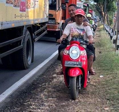 Bupati Mahayastra terpaksa turun dari mobil dan menumpang ojek untuk menuju pelabuhan Ketapang, Gilimanuk, Jawa Timur.