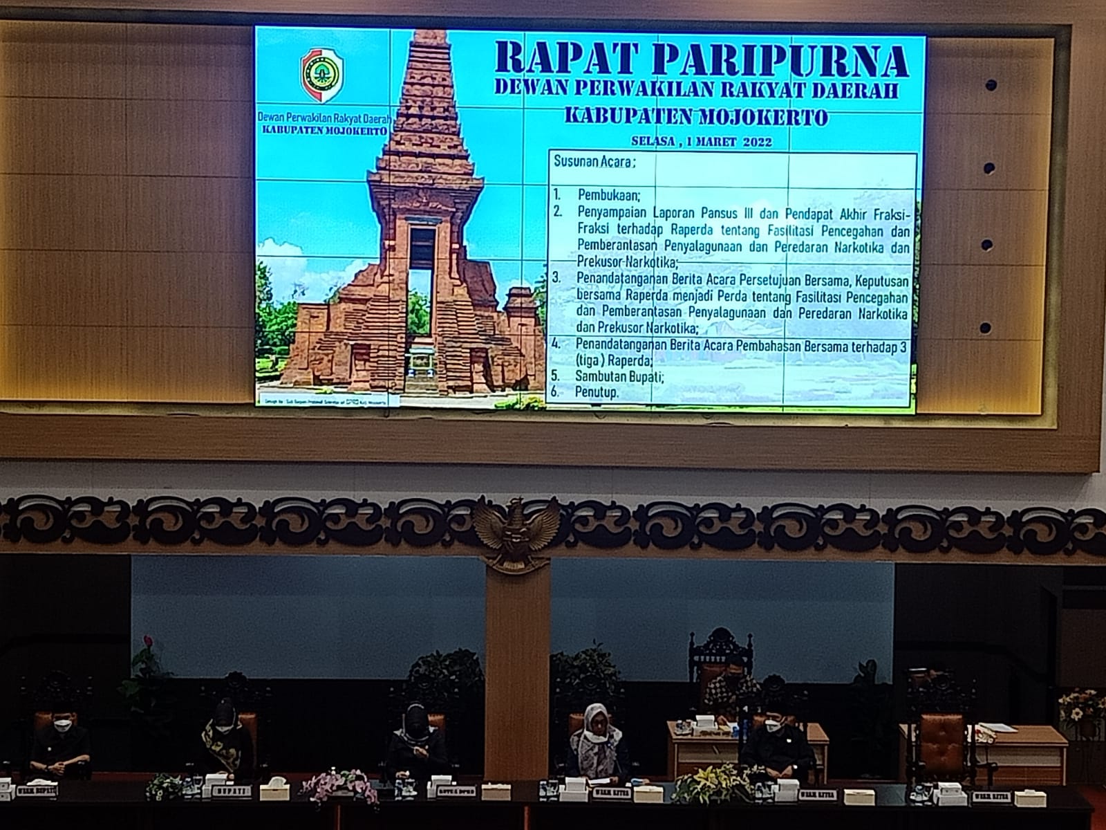 Setalah memberikan sambutan Bupati Mojokerto Ikfina dan Wakil Bupati Mojokerto Gus Barra mendatangani berita acara persetujuan bersama keputusan bersama Raperda menjadi Perda tentang fasilitasi pencegahan dan pberantasan penyalahgunaan dan peredaran narkotika dan prekusor narkotika. ( Harun )