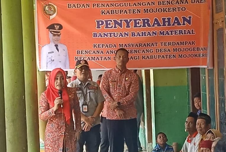 Pemkab Mojokerto melalui Badan Penanggulangan Bencana Daerah (BPBD) Kabupaten Mojokerto menyalurkan bantuan penanganan pasca bencana angin kencang yang menerjang empat desa di Kecamatan Kemlagi.