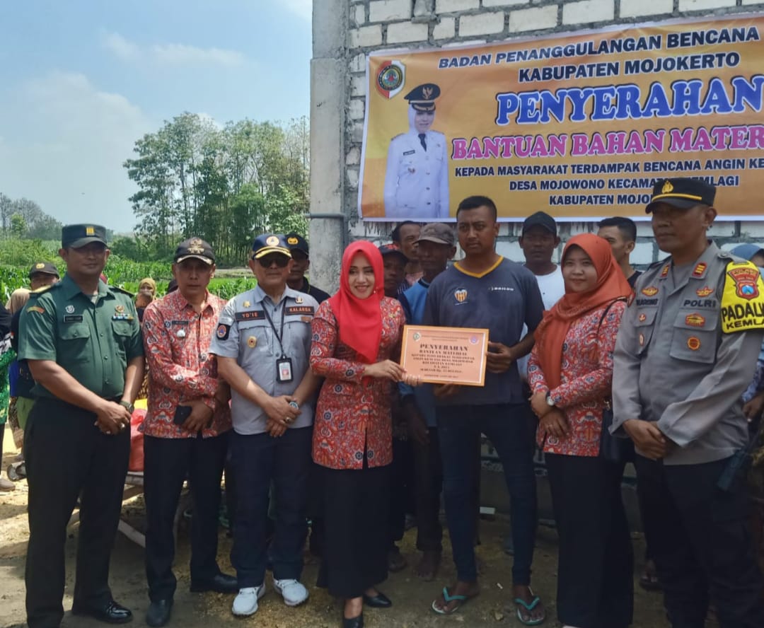 Pemkab Mojokerto melalui Badan Penanggulangan Bencana Daerah (BPBD) Kabupaten Mojokerto menyalurkan bantuan penanganan pasca bencana angin kencang yang menerjang empat desa di Kecamatan Kemlagi.