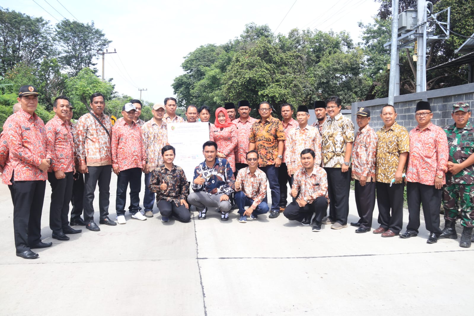 Bupati Ikfina didampingi Kadis DPMD H Yudha Akbar Prabowo SE MM, Camat Pungging Amsar Azhari Siregar SH MM photo bersama dengan Kepala Desa se Kecamatan Pungging