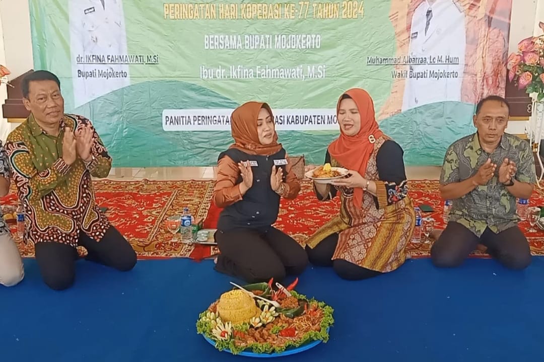 Bupati Ikfina didampingi Kadis Koperasi dan Usaha Mikro Abdullah Muhtar memberikan tumpeng kepada Ketua Dekopinda Kabupaten Mojokerto Hj Umy Zaidah