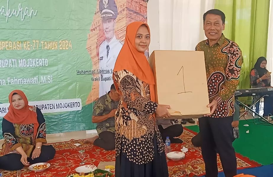 Bupati Mojokerto dr Ikfina Fahmawati menghadiri peringatan Hari Koperasi yang ke-77, di Pendopo Kecamatan Jetis, Minggu ( 21 /07 / 2024 ) pagi yang diwarnai dengan door prize undian berhadiah yang diserahkan oleh Kepala Dinas Koperasi dan Usaha Mikro H. Abdulloh Muhtar, S.Sos, MM, dan pemotongan tumpeng oleh Bupati Mojokerto dr Ikhfina Fahmawati yang diberikan kepada Ketua Dewan Koperasi Indonesia Daerah ( Dekopinda ) Kabupaten Mojokerto Kabupaten Mojokerto Hj. Umy Zaidah SE, M.Hum.