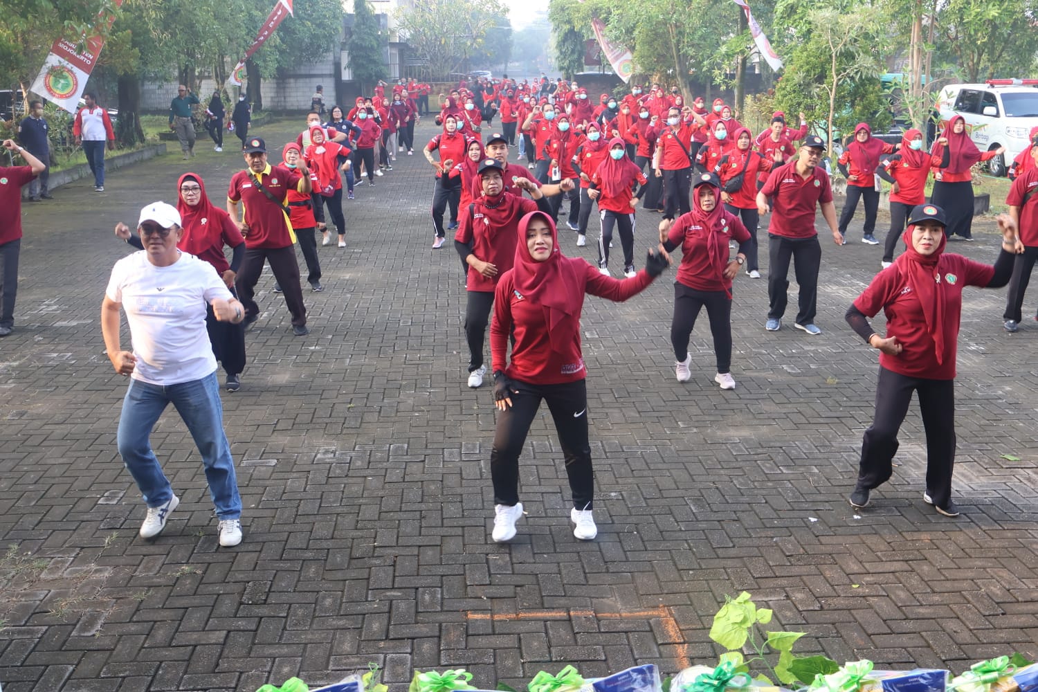 Didampingi Kepala Pelaksanaan Badan Penanggulangan Bencana Daerah Kabupaten Mojokerto, Yo’i Afrida serta pengurus DPD PPNI Kabupaten Mojokerto, lebih dulu Bupati Ikfina melaksanakan senam bersama.