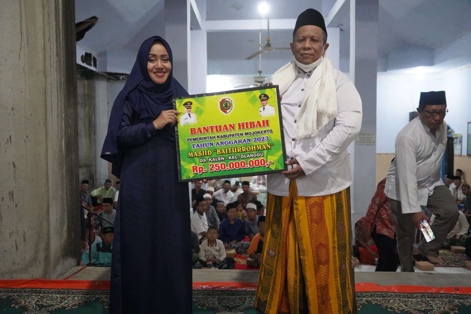 Dalam kesempatan ini, Bupati Ikfina menyerahkan bantuan senilai Rp.250 juta untuk pembangunan sarana ibadah masjid Baitur Rahman. Tak hanya itu, Bupati perempuan pertama di Kabupaten Mojokerto itu juga memberikan santunan kepada 64 anak yatim dari masing-masing desa se-Kecamatan Dlanggu.