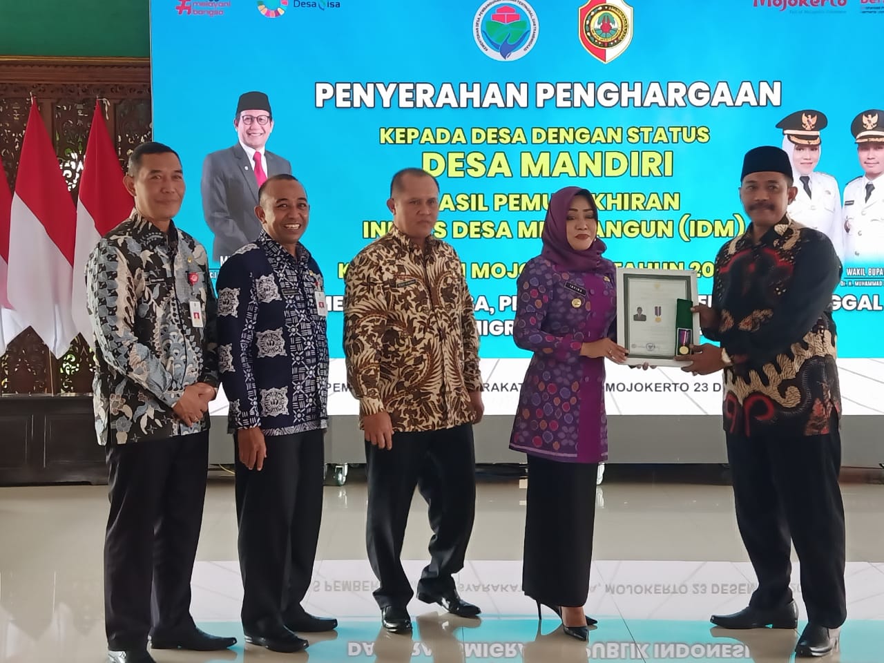 Adapun 69 desa mandiri yang menerima penghargaan IDM tahun 2022, antara lain Desa Banjaragung, Kenanten, Medali, tangunan, Tambakagung dan Balongmojo di Kecamatan Puri. Desa Pungging, Lebaksono, Ngrame, Jabon tegal, bangun di Kecamatan Pungging. Desa Bangsal, Sumbertebu, Puloniti di Kecamatan Bangsal. Desa Kepuhanyar, Jabon, Lengkong, Gayaman, Kwatu di Kecamatan Mojoanyar. Desa Kemasantani, Padi, Pugeran, Gondang, Centong, Pohjejer, Kebontunggul, Karangkuten, Jatidukuh, Bakalan, dan Desa Begaganlimo di Kecamatan Gondang.