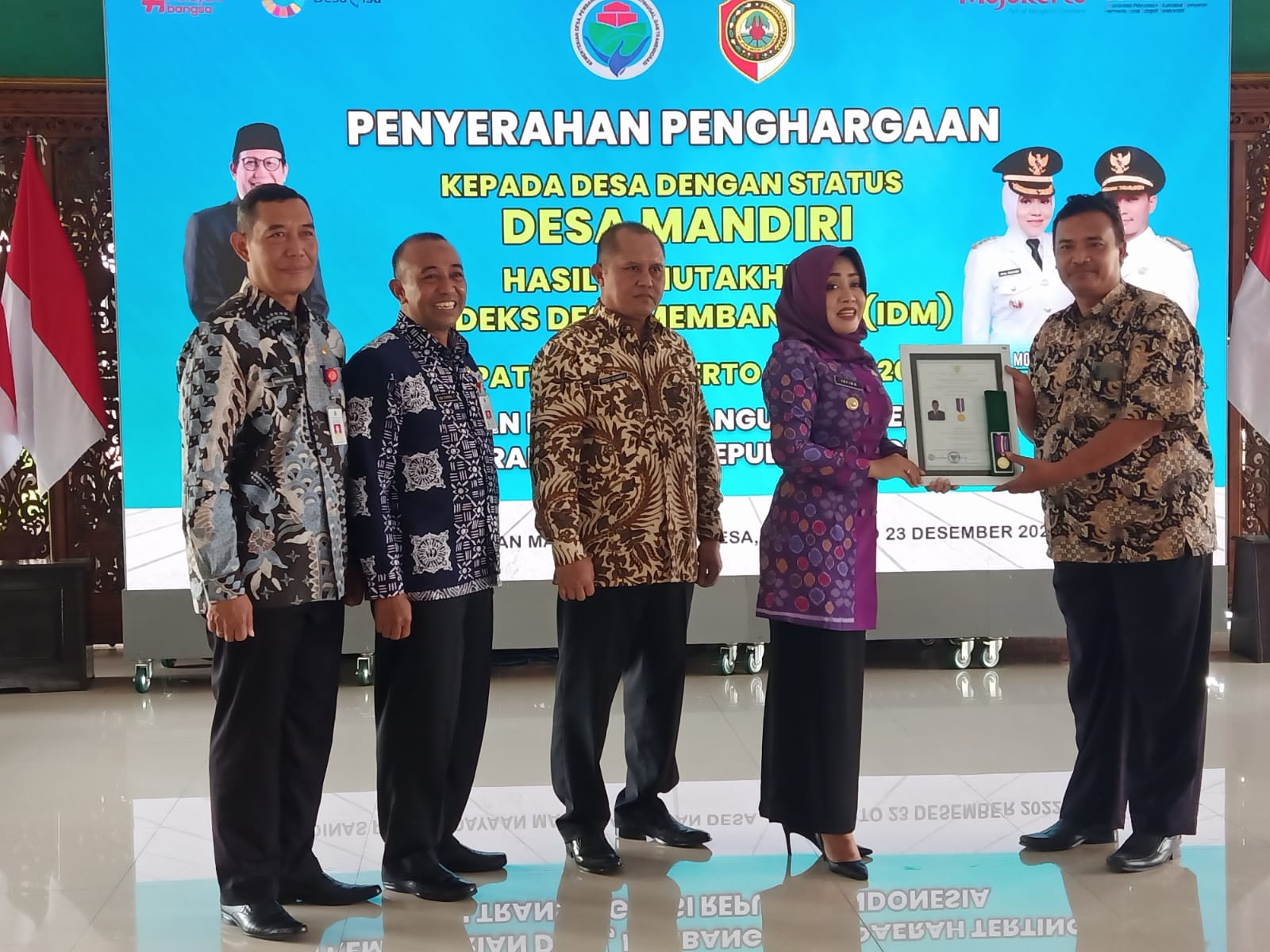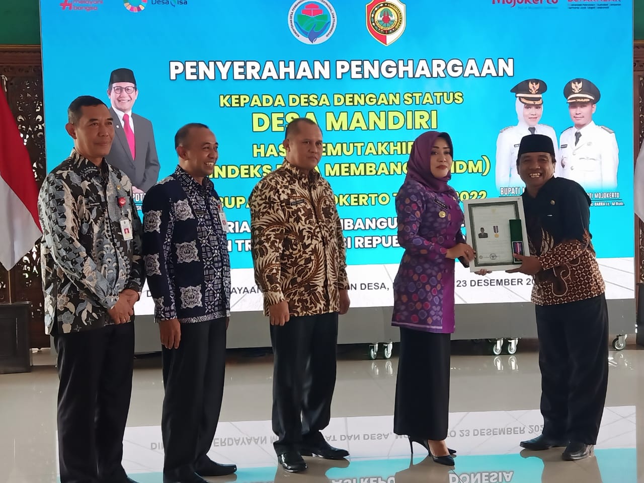 Bupati Mojokerto dr. Ikfina Fahmawati, M.Si, didampingi Sekdakab Drs. Teguh Gunarko, Asisten I Dr. H. Didik Chusnul Yakin, dan Kepala DPMD H. Yudha Akbar Prabowo SE MM, menyerahkan penghargaan kepada 69 Desa Mandiri hasil Pemutakhiran Indeks Desa Membangun (IDM) Kabupaten Mojokerto tahun 2022.