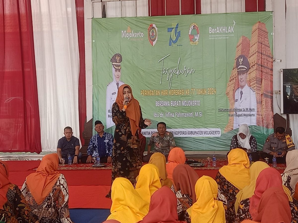Bupati Mojokerto dr. Ikfina Fahmawati menghadiri peringatan Hari Koperasi yang ke-77 tahun 2024 di Pendopo Kecamatan Puri, pada Sabtu (13/7) pagi yang diwarnai pemotongan tumpeng oleh Bupati Mojokerto dr Ikhfina Fahmawati yang diberikan kepada Kepala Dinas Koperasi dan Usaha Mikro Kabupaten Mojokerto H. Abdulloh Muhtar, S.Sos, MM., yang acaranya juga diwarnai Hiburan Musik Elekton dan Campursari serta Door Prize untuk Pengurus Kopwan.