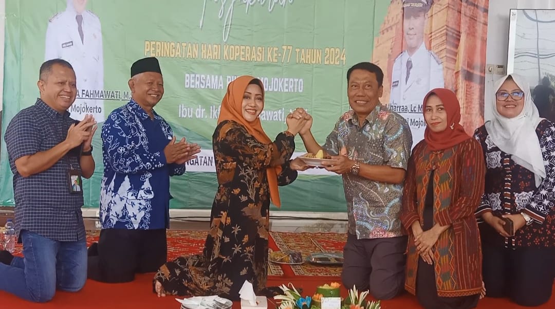 Bupati Mojokerto dr. Ikfina Fahmawati menghadiri peringatan Hari Koperasi yang ke-77 tahun 2024 di Pendopo Kecamatan Puri, pada Sabtu (13/7) pagi yang diwarnai pemotongan tumpeng oleh Bupati Mojokerto dr Ikhfina Fahmawati yang diberikan kepada Kepala Dinas Koperasi dan Usaha Mikro Kabupaten Mojokerto H. Abdulloh Muhtar, S.Sos, MM., yang acaranya juga diwarnai Hiburan Musik Elekton dan Campursari serta Door Prize untuk Pengurus Kopwan.
