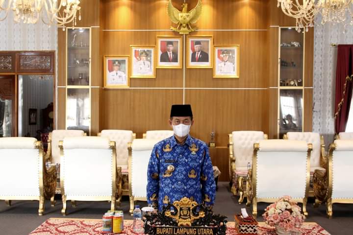 Bupati Lampung Utara (Lampura), H. Budi Utomo mengikuti Upacara Hari Kebangkitan Nasional (Harkitnas) Ke-114 Tahun 2022 secara virtual di rumah dinasnya, Jum’at (20/5/2022).