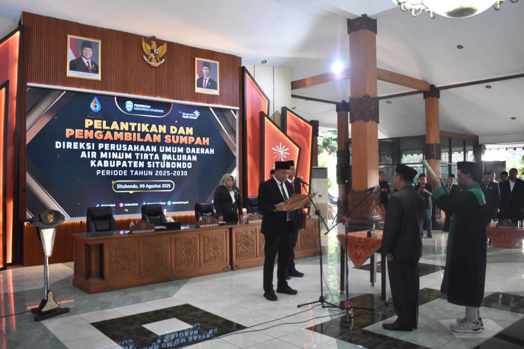 Akhirnya Pemerintah Kabupaten Situbondo resmi melantik dan mengambil sumpah Direksi Perusahaan Umum Daerah Air Minum (Perumda) Tirta Baluran untuk periode 2025-2030, Sabtu (09/08/2025).