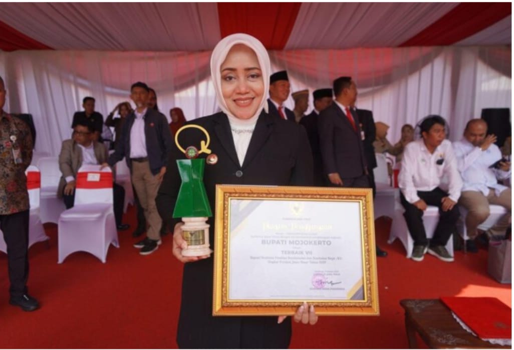 Bupati Mojokerto Ikfina Fahmawati meraih penghargaan sebagai Pembina Keselamatan dan Kesehatan Kerja (K3) Terbaik VII di Tingkat Provinsi Jawa Timur tahun 2024.
