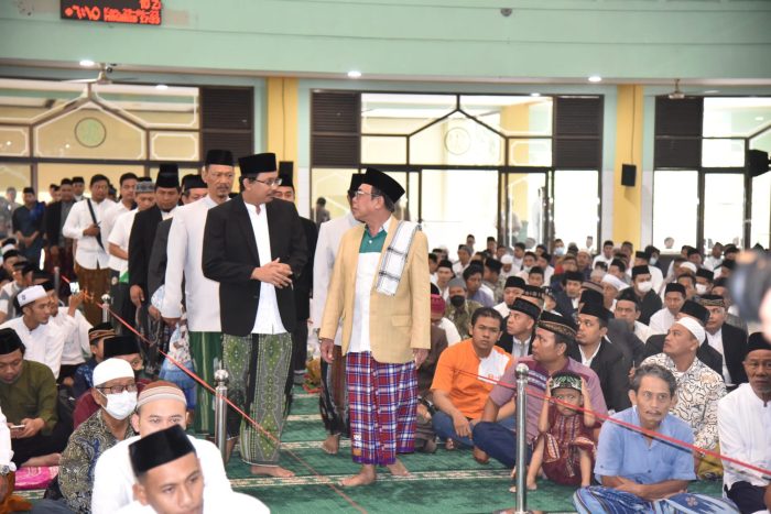Bupati Sidoarjo Ahmad Muhdlor Ali beserta istri Hj. Sa’adah Ahmad Muhdlor melaksanakan sholat Idul Adha 1444 Hijriyah di Masjid Agung Sidoarjo (MAS). Mengenakan jas hitam lengkap dengab peci Gus Muhdlor keluar dari rumah dinas Pendopo Delta Wibawa pukul 06.00 Wib. Kamis (29/6/2023).