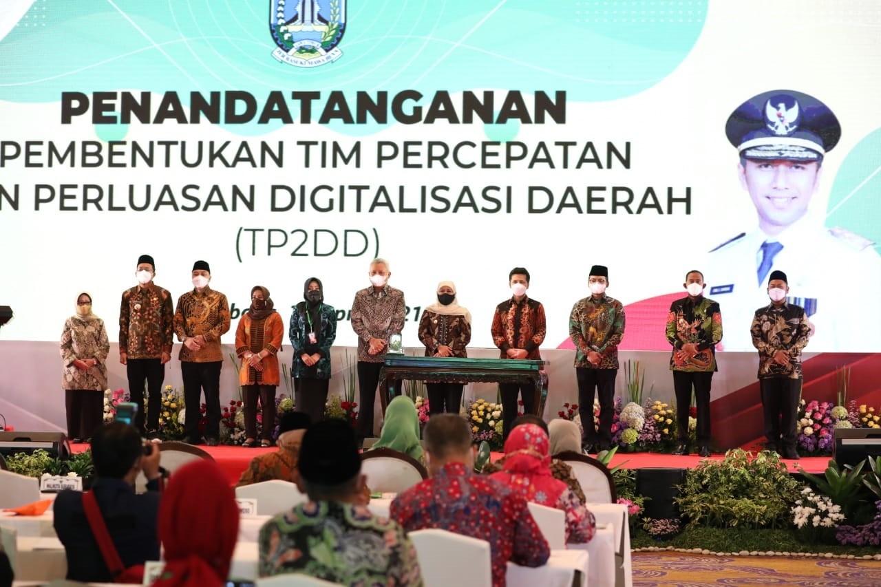 Disaksikan Gubernur Jatim dan Wagub Jatim, enam belas bupati/walikota selaku Ketua Satgas TP2DD di daerahnya masing-masing tersebut melakukan penan datanganan komitmen bersama menjalankan program percepatan TP2DD di daerahnya masing-masing. Kamis, (15/4/2021) di Shangrilla Hotel Surabaya bersa maan dengan kegiatan Musrenbang Jatim.