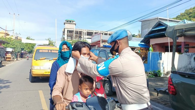 Pembagian masker gratis bagi pengguna jalan di pasar Wodi Desa Bakajaya kecamatan Woja, Senin, 14 Maret 2022