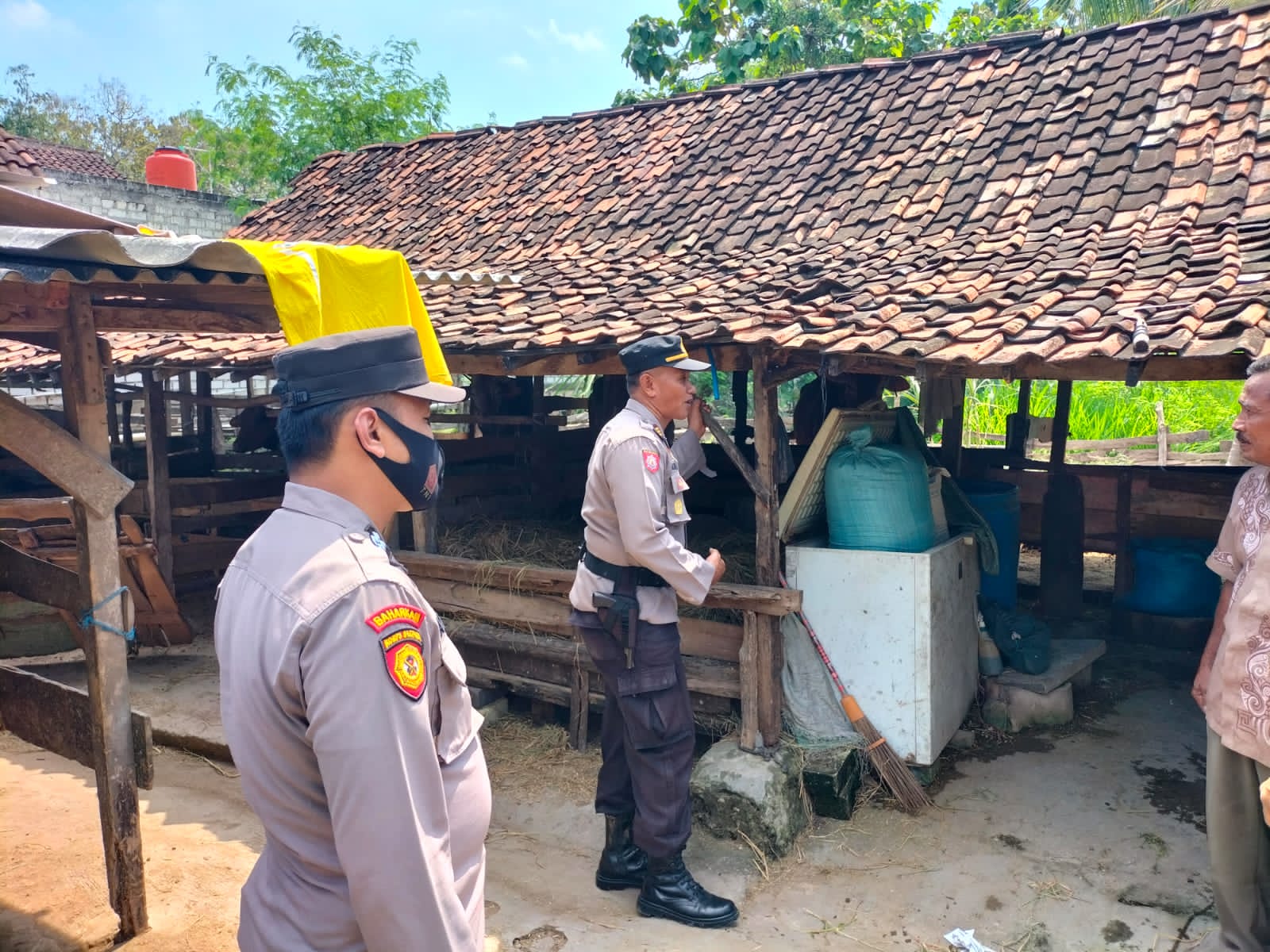 Cegah penyebaran PMK Kapolsek Mantup polres Lamongan AKP M.Kosim SH bersama anggota cek kandang sapi dan binluh kepada pemilik hewan ternak sapi di dusun Tunggun desa Tungunjagir kecamatan Mantup  pada 20 Juli 2022