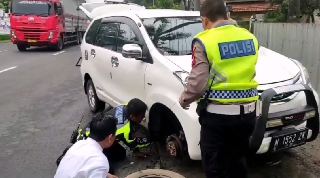 Tampak dua anggota Polantas saat melaksanakan patroli berhenti ketika melihat seorang pengendara yang mendapat masalah karena ban mobilnya bocor.