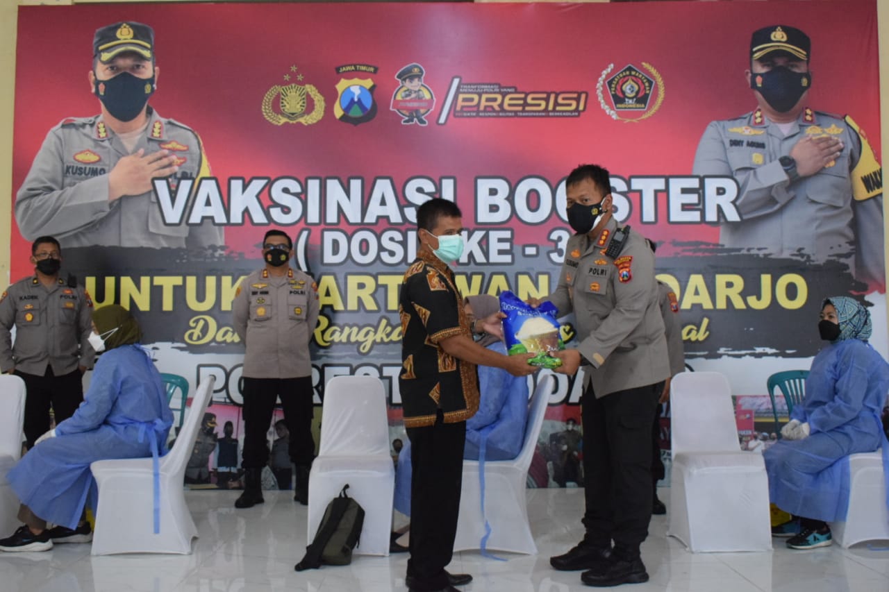 Kapolresta Sidoarjo Komisaris Besar Polisi Kusumo Wahyu Bintoro didampingi Wakapolresta Sidoarjo AKBP Deny Agung Andriana dan pejabat utama Polresta Sidoarjo, meninjau vaksinasi booster jenis Astra Zeneca sebanyak 200 dosis untuk wartawan Sidoarjo tersebut.