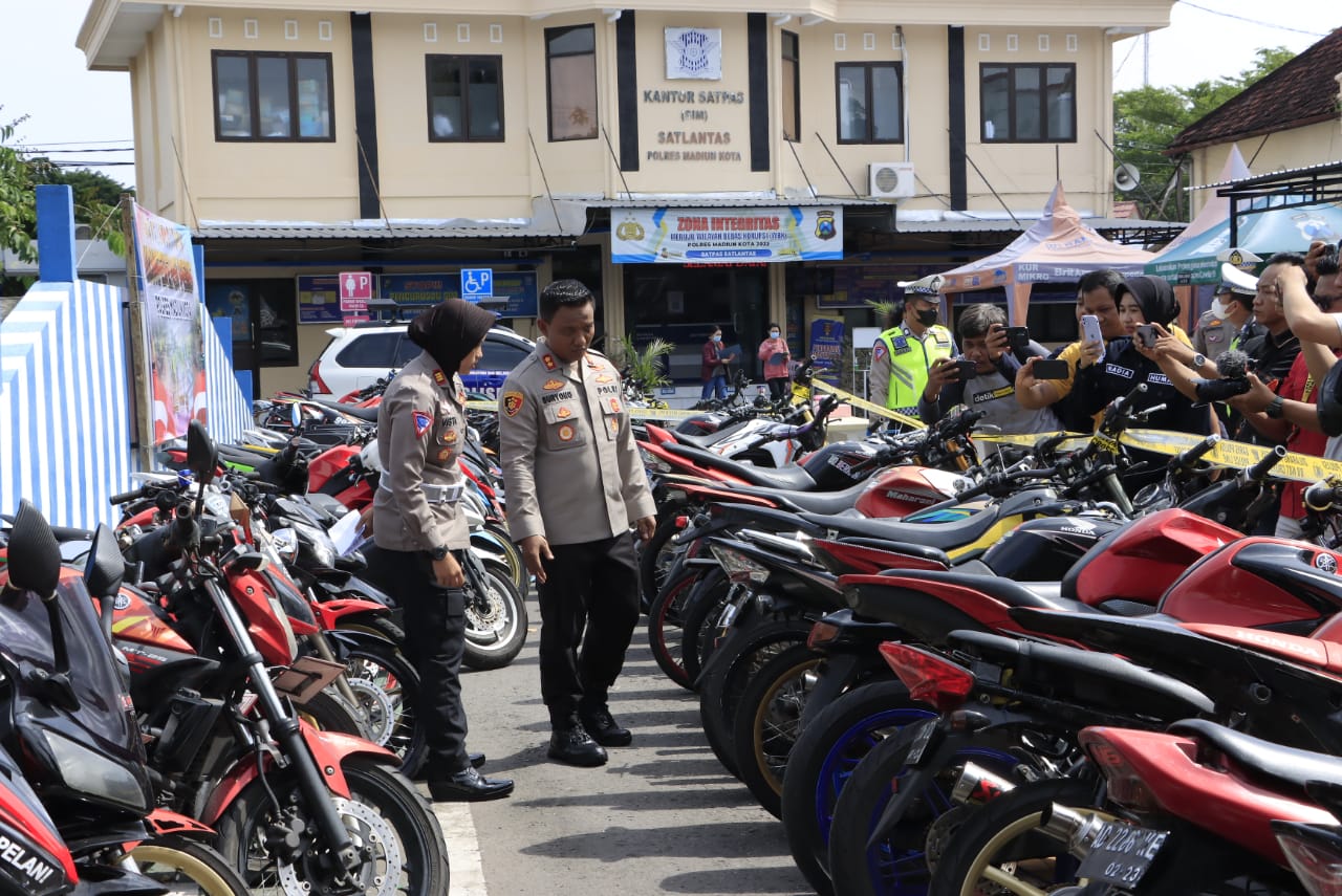 Sebanyak 215 unit R2 hasil giat cipta kondisi Harkamtibmas penindakan pelanggaran lalu lintas digelar dihadapan awak media dalam press release di halaman Mapolres Madiun Kota, Rabu (25/01/2023).