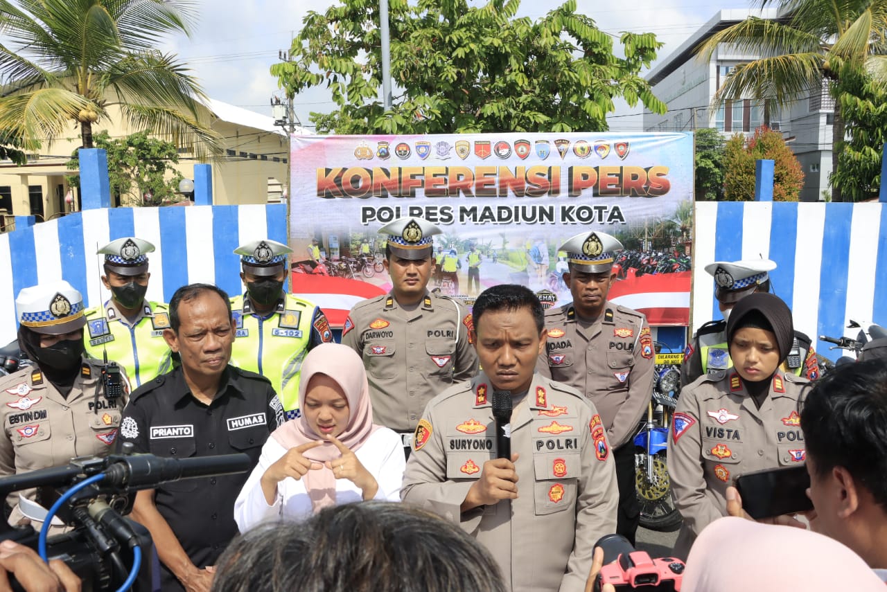 Kapolres Madiun Kota AKBP Suryono SH., SIK., MH., menjelaskan hasil giat cipta kondisi berhasil menjaring sebanyak 215 Unit R2 yang melakukan pelanggaran diantaranya knalpot brong, tidak memakai helm, tidak memiliki SIM dan juga tidak bisa menunjukkan surat tanda kendaraan bermotor, “Jelasnya.