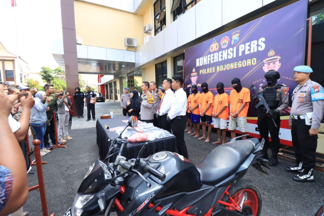 Polres Bojonegoro menggelar konferensi pers guna menyampaikan hasil pengungkapan kasus tindak pidana pengeroyokan hingga mengakibatkan satu orang meninggal dunia.
