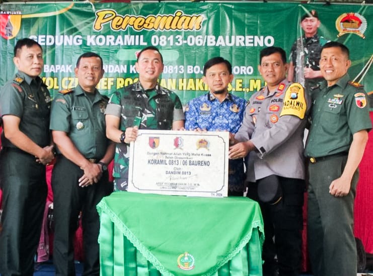 Komandan Kodim (Dandim) 0813 Bojonegoro Letnan Kolonel Czi Arief Rochman Hakim, SE., MM., meresmikan bangunan baru kantor Markas Koramil 06/Baureno. Peresmian kantor yang terletak di Jalan Raya Bojonegoro – Babat turut Desa/Kecamatan Baureno tersebut, ditandai dengan penandatanganan prasasti, Rabu (19/6/2024).