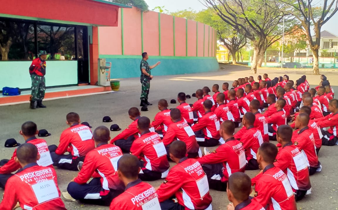 Komandan Kodim (Dandim) 0813 Bojonegoro Letkol Czi Arief Rochman Hakim, SE., MM., memberikan motivasi dan arahan anggota Pasukan Pengibar Bendera (Paskibra) Kabupaten Bojonegoro di Stadion Letjend H. Soedirman, agar dalam mengikuti latihan penuh semangat, sehingga saat pelaksanaan nantinya berhasil sesuai target yang telah diharapkan, Selasa (23/7/2024).