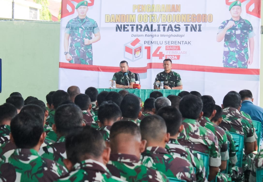 Netralitas TNI pada Pemilihan Umum (Pemilu) tahun 2024 dengan tidak memihak Pasangan Calon (Paslon) dan Partai Politik (Parpol) tertentu menjadi hal yang mutlak dilakukan oleh seluruh prajurit TNI dimana pun bertugas, termasuk bagi anggota TNI dan Pegawai Negeri Sipil (PNS) jajaran Kodim 0813 Bojonegoro.