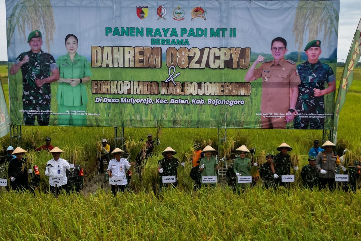 Bersama Kelompok Tani (Poktan) Sarimulya 1 dan 2, Komandan Korem (Danrem) 082/CPYJ Kolonel Inf Batara Alex Bulo, melakukan panen raya padi Masa Tanam (MT) kedua seluas 230 hektar di Desa Mulyorejo Kecamatan Balen Kabupaten Bojonegoro, Jawa Timur, Rabu (15/1/2025).