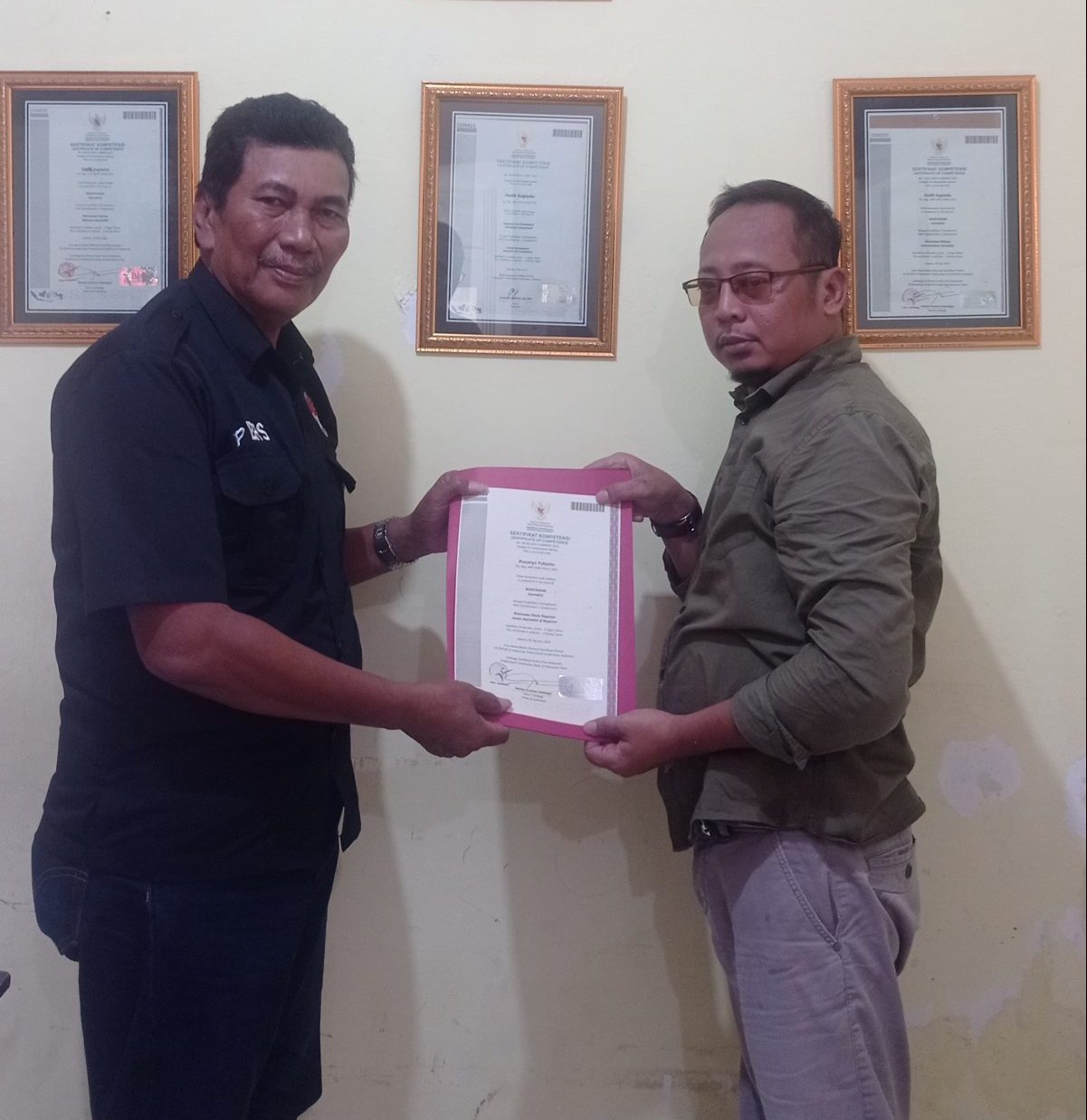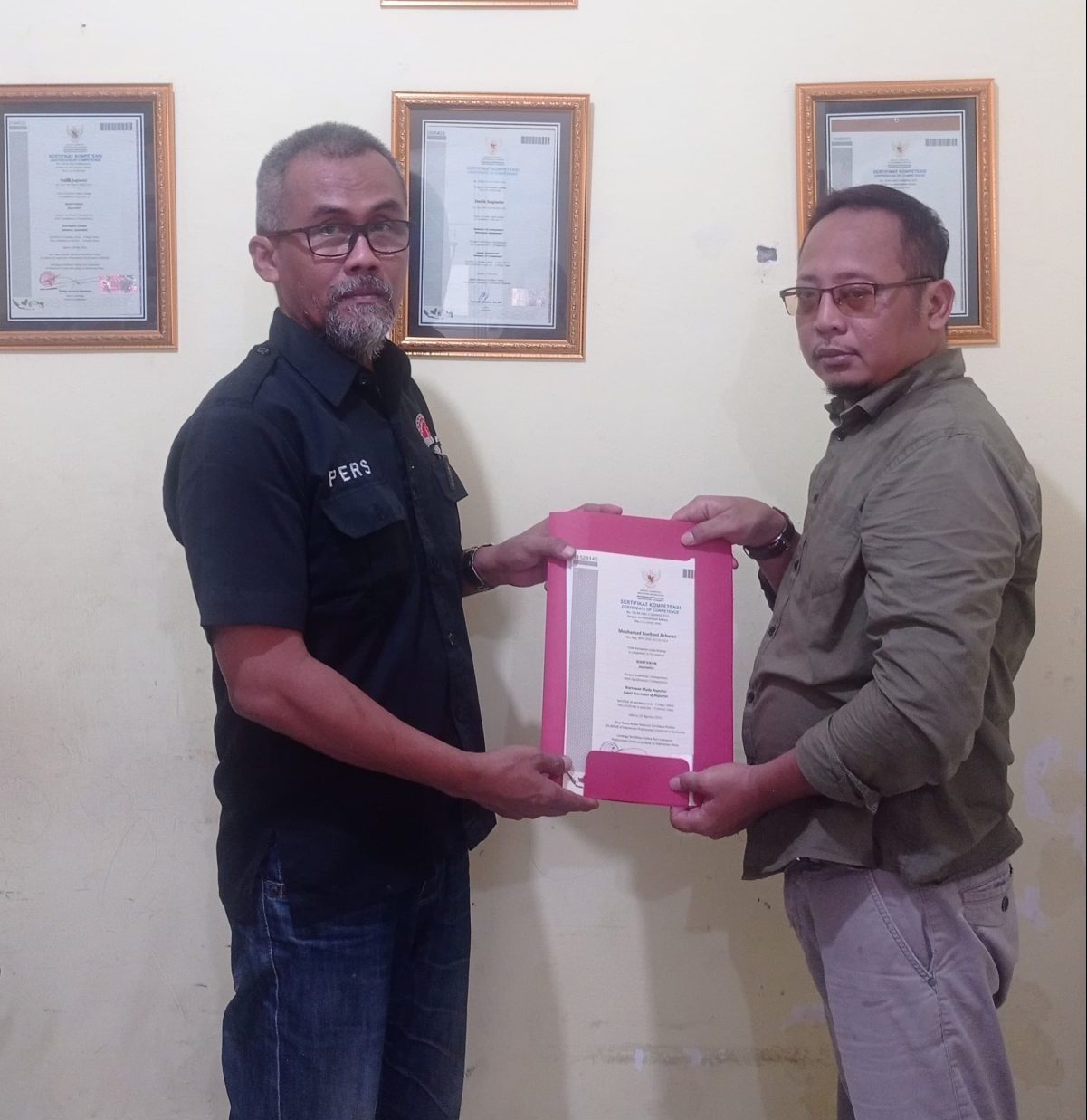 Ketua Umum SWI (Sindikat Wartawan Indonesia), Dedik Sugianto, menyerahkan Surat Keputusan (SK) Kepengurusan SWI Madiun, Jawa Timur, dan menyerahan Sertifikat Kompetensi Wartawan Muda Reporter kepada 3 anggota SWI Madiun. Jumat (10/11/2023) dikantor sekretariat SWI jalan Kedung Antar VII/50, Surabaya.