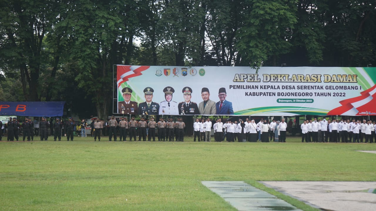 Pemkab Bojonegoro melalui Dinas Pemberdayaan Masyarakat dan Desa (DPMD) menyelenggarakan Apel Deklarasi Damai Pilkades Serentak Gelombang I (pertama). Deklarasi dilaksanakan di Alun-Alun Bojonegoro, Jumat (21/10/2022). Meski sempat diguyur hujan, apel deklarasi berlangsung tertib dan khidmat.