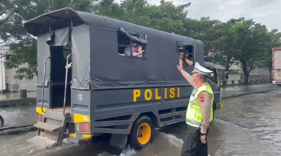 Demi Keselamatan Pengguna Jalan, Polisi Basah Kuyup Atur Arus Lalin di Tengah Banjir