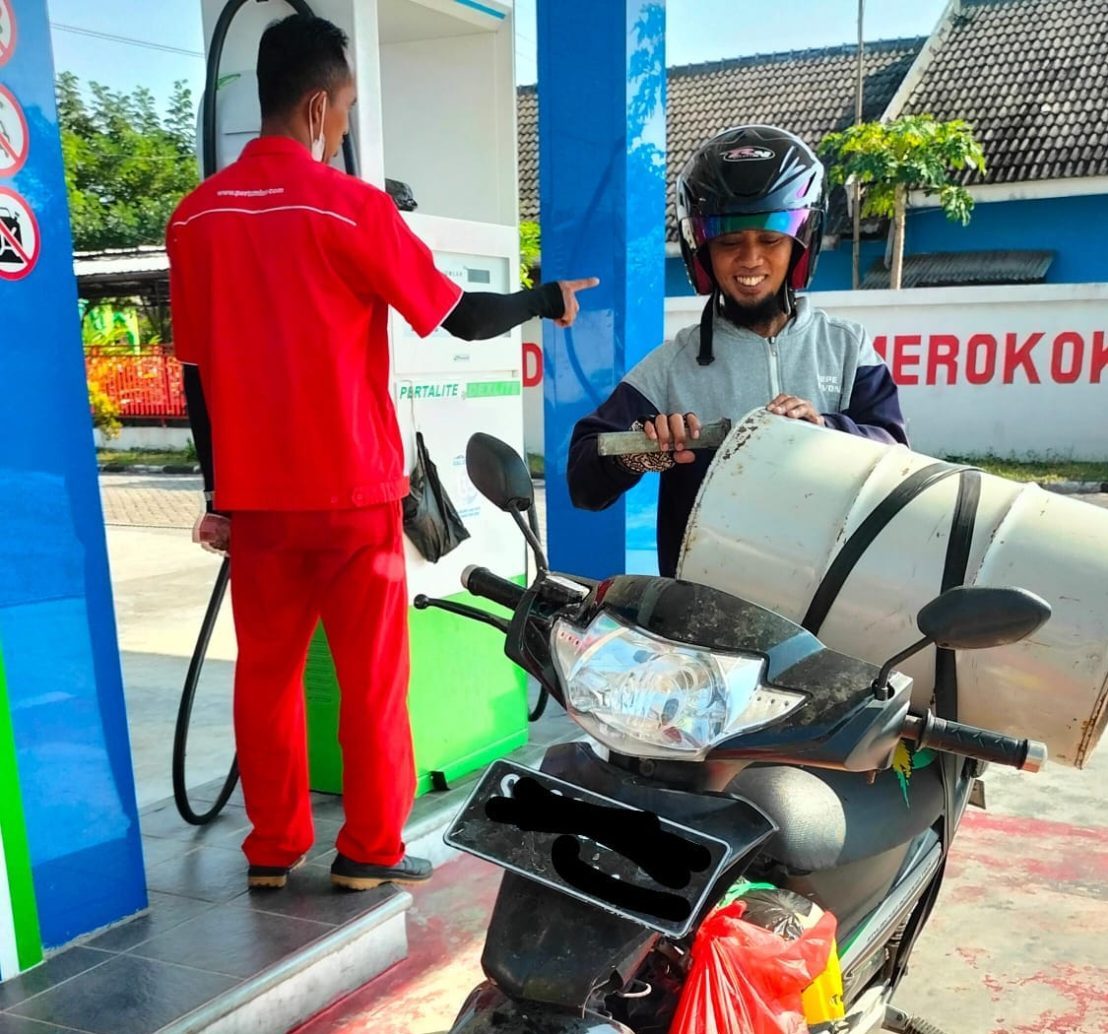 Eko warga Desa Jatipayak Kecamatan Modo kabupaten Lamongan sudah terbiasa dan bahkan tiap hari membeli BBM Bersubsidi di SPBU Brangkal untuk dijual lagi, Selasa 28/5/2024.