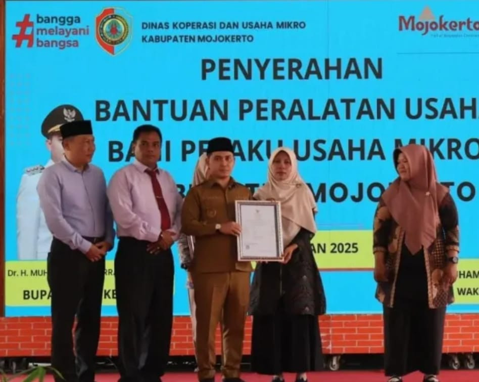 Pemerintah Kabupaten Mojokerto melalui Dinas Koperasi dan Usaha Mikro Kabupaten Mojokerto menyerahkan ratusan bantuan peralatan bagi para pelaku usaha mikro di Bumi Majapahit, Senin (22/12) siang yang Digelar di Pendopo Graha Majatama.